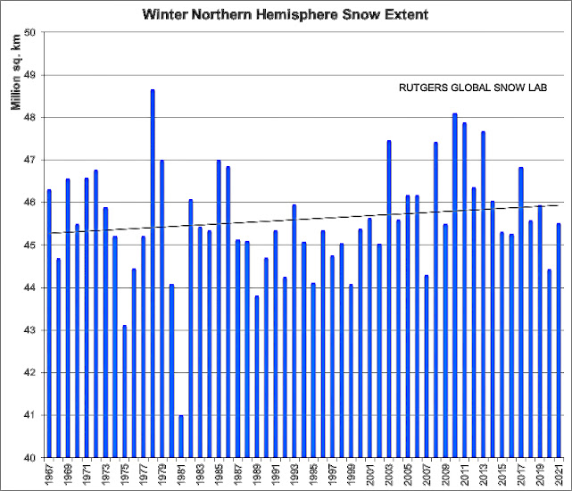 ... the renowned Global Snow Lab research group at Rutgers University confirms that actually snow extent in the northern hemisphere has increased over the last 30 years amidst modest warming,