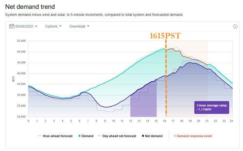 At approximately 3:20 Tuesday afternoon, system demand across the state hit an all-time high of 50.6K megawatts, which rose to 51.4K right before 4pm. Then, at approximately 4:15 p.m. local time, demand dipped - as Californians clearly reduced electricity usage, while solar customers with battery backups initiated automatic load shifting programs - running their homes off the battery instead of the grid (typically done daily to avoid the more expensive 4pm-9pm peak energy pricing).